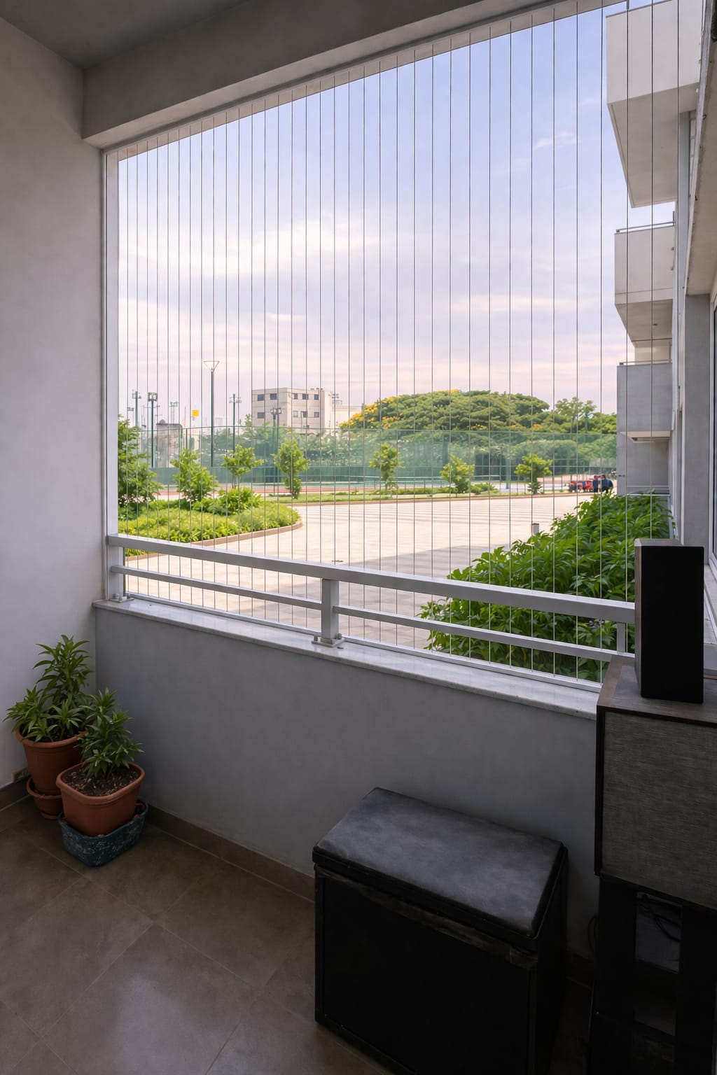 Villa invisible grills are premium safety systems designed using high-tensile stainless steel wires that provide strong protection without affecting the luxury look of your villa. These grills are sleek, modern, and almost invisible from a distance.